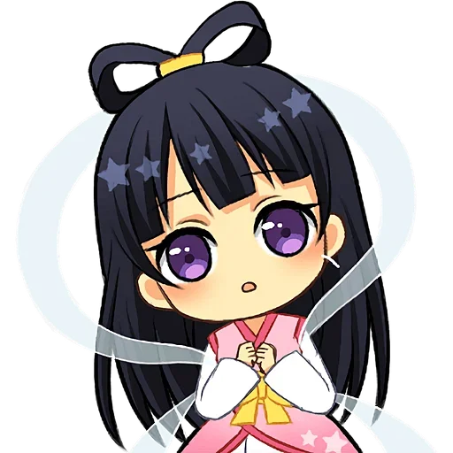 Garota de olhos roxos e cabelos pretos com uma expressão surpresa, vestindo um quimono rosa com estrelas brancas e detalhes em amarelo.