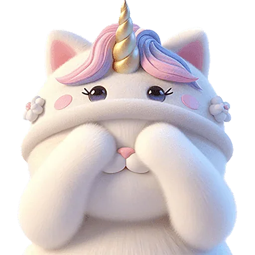 Gatinho unicórnio branco com chifre dourado, cabelo rosa e azul, e olhos pretos. Ele cobre o rosto com as patas.