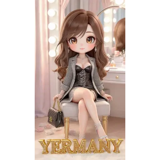 Boneca de estilo anime sentada em uma cadeira, com cabelo castanho longo e roupa cinza. Ela está nua da cintura para…