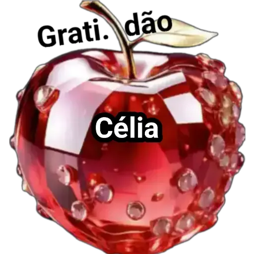 Uma maçã vermelha brilhante com gotículas de água, folhas verdes e o texto 'Gratidão' e 'Célia' sobreposta.