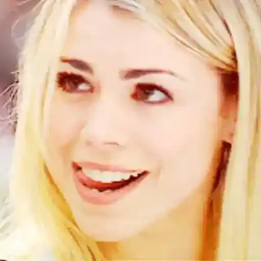 Rosto de uma jovem mulher loira com um sorriso leve e olhar suave.