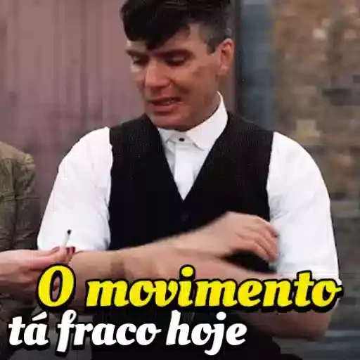 Um homem com cabelo preto e um colete preto sobre uma camisa branca, com uma expressão facial séria e um cigarro na mão, ao lado de outra pessoa. A legenda 'O movimento tá fraco hoje' aparece em destaque.