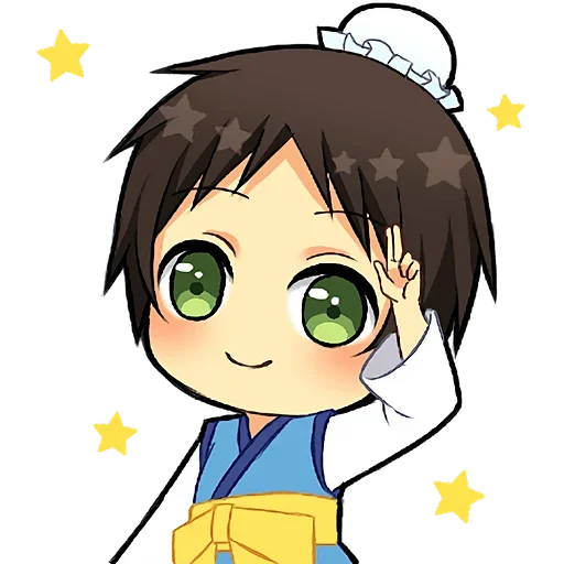 Menino de anime com cabelo castanho e olhos verdes sorrindo e acenando com a mão, usando um yukata azul e amarelo com estrelas douradas ao fundo.