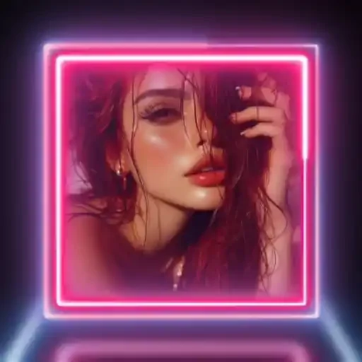 Mulher com cabelo molhado e maquiagem pesada, olhando para frente com uma mão no rosto, dentro de um quadro rosa neon.