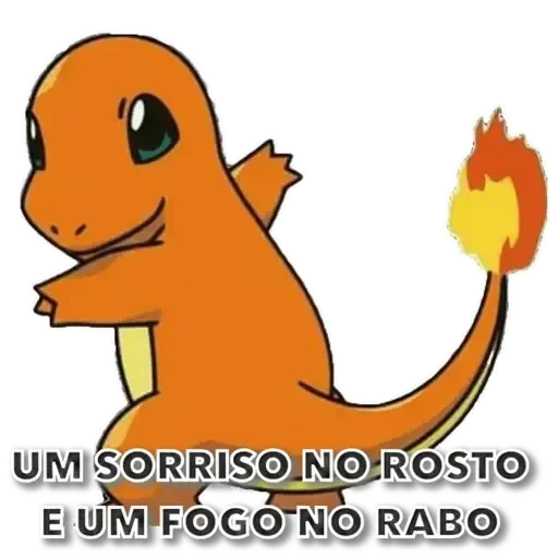 Um Charmander de Pokémon com um sorriso no rosto e uma chama laranja e amarela na ponta da cauda. O texto 'UM SORRISO NO ROSTO E UM FOGO NO RABO' está escrito abaixo.