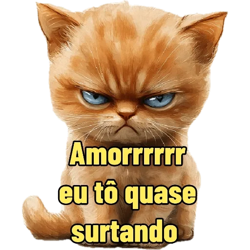 Gatito laranja com expressão de descontentamento, olhos azuis e texto amarelo que diz 'Amorrrrrr eu tô quase surtando'.