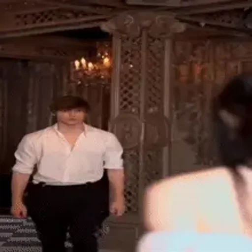 Um homem com camisa branca e calça preta olha para uma mulher com cabelo escuro em um ambiente com decoração ornada.