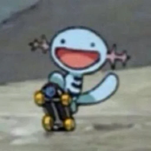 Um personagem de desenho animado com corpo azul e boca aberta, sorrindo, com um carrinho de skate preto e dourado.