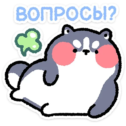 Um desenho de um animal fofinho cinza e branco com bochechas rosadas, olhos pequenos e um rabo. Ele está ao lado de um trevo verde e a frase 'ВОПРОСЫ?' aparece acima.