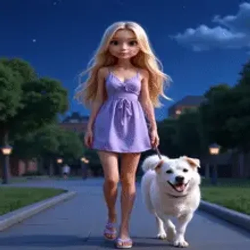 Uma menina de olhos azuis e cabelos loiros, vestindo uma blusa branca com suspensorios azuis, com uma expressão…