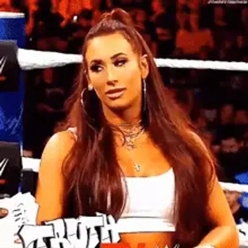 Mulher de cabelos castanhos e longos usando um top preto em um ringue de luta livre.