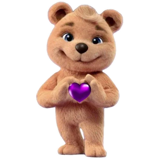 Um urso de pelúcia sorridente com um coração roxo nas mãos.