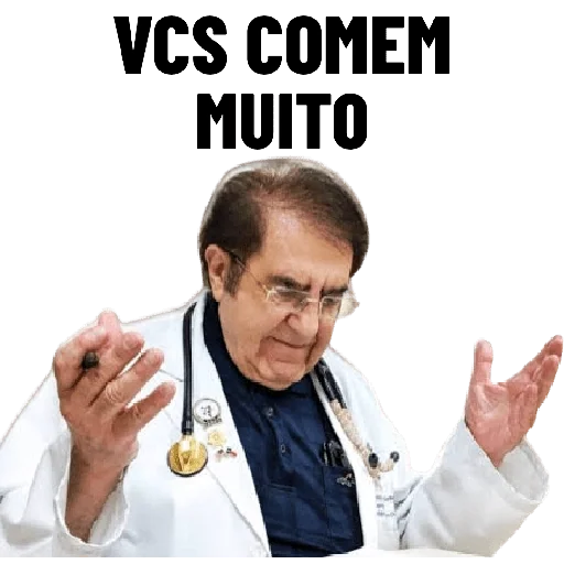 Um médico com estetoscópio e jaleco branco, parecendo surpreso ou questionador, com as mãos levantadas. O texto 'VCS COMEM MUITO' aparece acima dele em letras pretas.