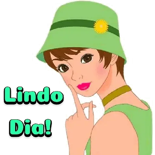 Uma mulher de cabelo castanho e chapéu verde olhando para o lado com a mão no rosto e o texto 'Lindo Dia!' ao lado.