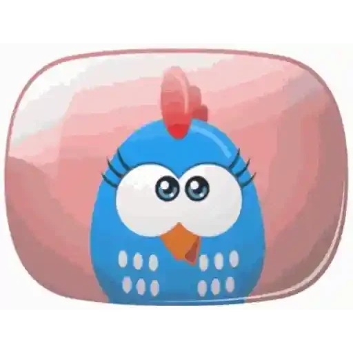 Um desenho de um frango azul com olhos grandes e penteado vermelho em cima da cabeça, contra um fundo rosa.