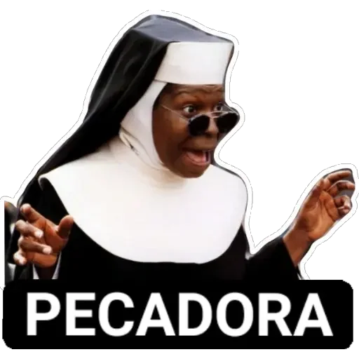 Freira negra com óculos de sol, vestida de preto e branco, com as mãos levantadas e a palavra 'PECADORA' abaixo dela.