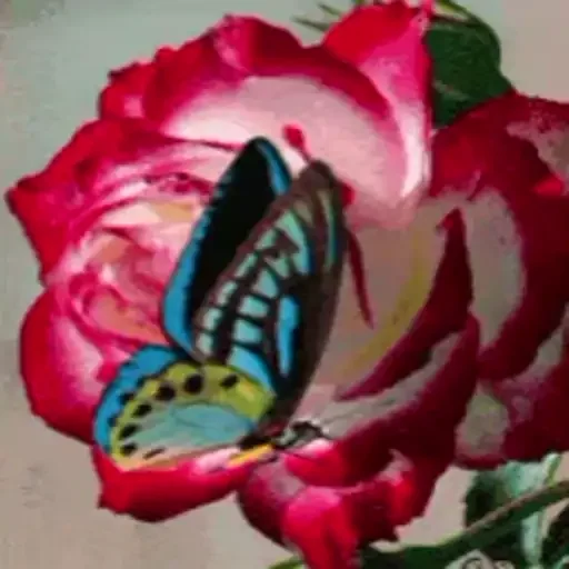 Uma borboleta azul e amarela com manchas pretas pousada em uma rosa vermelha.