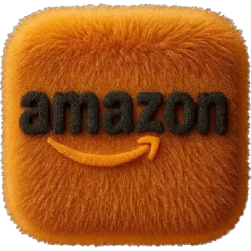 Um sticker com o logotipo da Amazon em preto e uma seta curva laranja, sobre um fundo laranja felpudo.