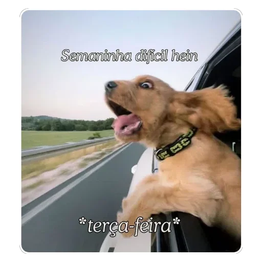 Cachorro com a cabeça para fora do carro, língua para fora, colar verde e amarelo. Legenda 'Semelhante difícil hein *tereza fera*'
