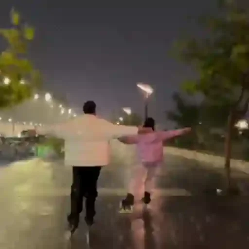 Casal caminhando de mãos dadas à noite, com braços abertos e lanternas na mão, em uma rua iluminada.