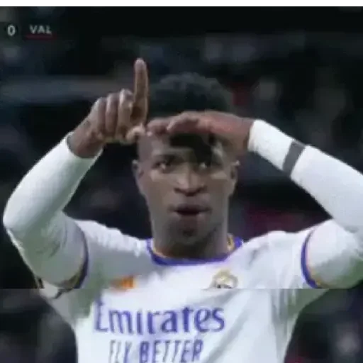 Jogador de futebol com as mãos na cabeça e dedo indicador para cima, vestindo uma camisa branca com 'Emirates FLY BETTER' em azul. Fundo escuro.