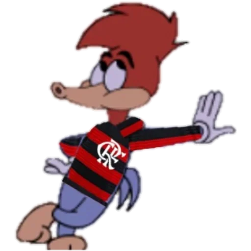 Personagem de desenho animado com cabelo vermelho, usando uma camisa listrada em vermelho e preto com um logotipo branco, calça azul e fazendo um gesto com a mão.