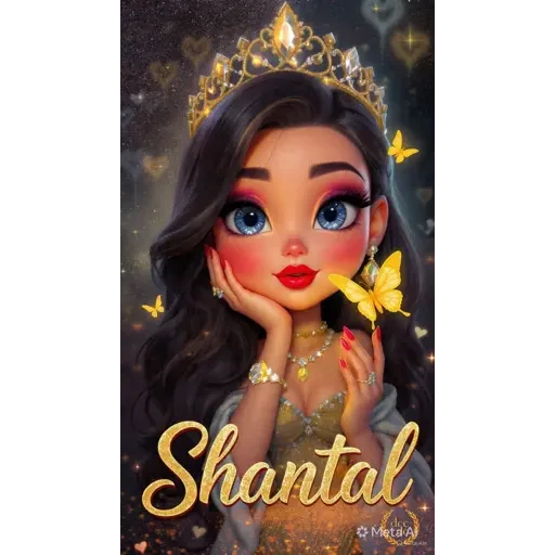 Uma princesa de olhos azuis e cabelos pretos usando uma coroa dourada, com a mão no rosto e um beija-flor amarelo perto da boca. O nome 'Shantal' está escrito em ouro na parte inferior.