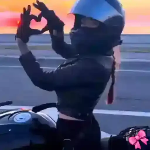 Mulher de capacete fazendo um gesto com as mãos em frente a um pôr do sol, sentada em uma motocicleta.