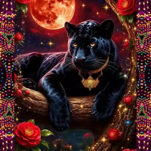 Um tigre preto jaz em um galho de árvore sob a luz de uma lua cheia brilhante. O tigre tem um colar com um medalhão dourado e olhos amarelos brilhantes. A imagem é rodeada por rosas vermelhas e uma moldura decorativa.