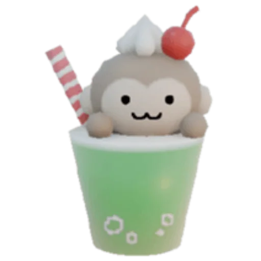 Um monstrinho cinza sorridente dentro de um copo de sorvete verde com cereja e palito.