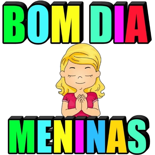 Menina loira com as mãos juntas em frente ao rosto e olhos fechados, vestindo uma blusa rosa, com as palavras 'BOM DIA MENINAS' em letras grandes e coloridas.