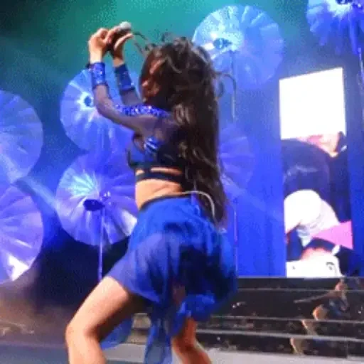 Mulher dançando em um palco com luzes azuis, usando um conjunto azul. Ela tem cabelo longo e está com os braços levantados.