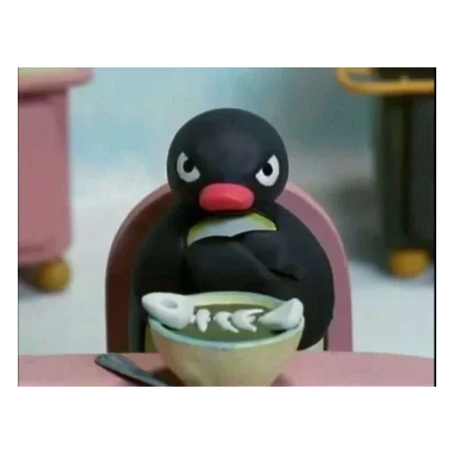 Um pinguim de pelúcia preto e redondo, com olhos grandes e um bico vermelho, sentado em uma cadeira rosa, comendo uma tigela de macarrão.