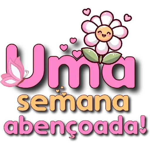 Uma flor rosa com um rosto feliz e folhas verdes, rodeada de corações rosa, com o texto 'Uma semana abençoada!' em letras coloridas.