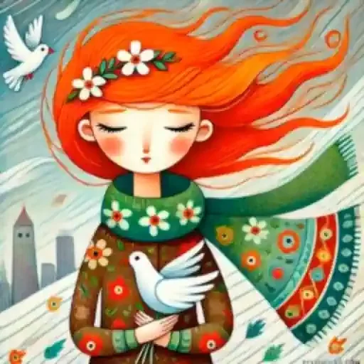 Uma menina com cabelos laranjas longos e flores na cabeça segura um pombo branco no colo, com uma cidade ao fundo e um pombo voando. Ela usa um casaco castanho com flores e um cachecol verde com flores.