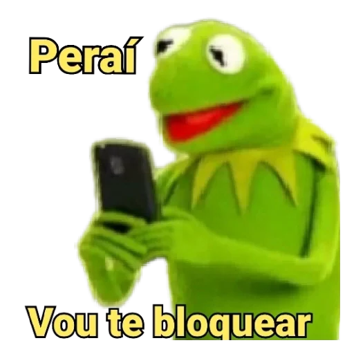 Kermit, o sapo verde do Muppet, olhando para um celular com um sorriso, com as frases 'Peraí' e 'Vou te bloquear' em amarelo.