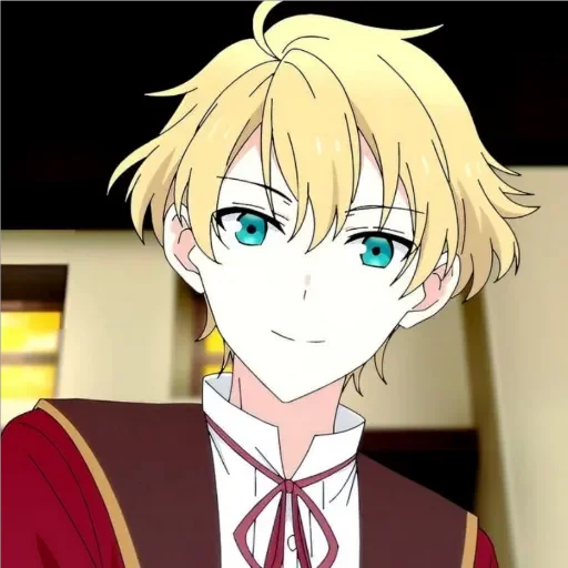Personagem de anime com cabelo loiro e olhos azuis, vestindo uma camisa branca e um casaco vermelho com detalhes em dourado.