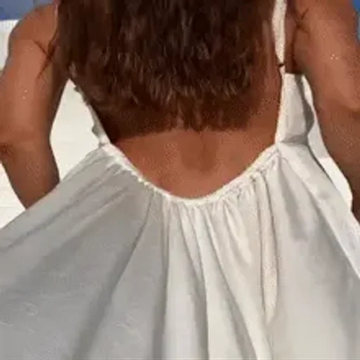 Mulher de costas com cabelo castanho e um vestido branco, em frente a uma cerca de madeira.