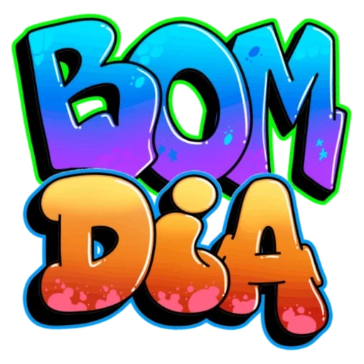 Um sticker colorido com o texto 'BOM DIA' em letras grandes e decorativas, com cores que mudam de azul para laranja.