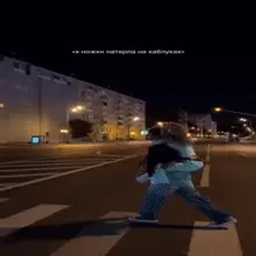 Uma pessoa vestida de preto e azul atravessando uma rua à noite, com um prédio ao fundo e texto branco no topo.