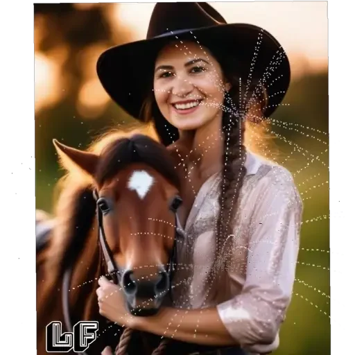 Uma mulher sorrindo, usando um chapéu preto e uma camisa branca, abraçando um cavalo castanho com uma marca branca na testa.