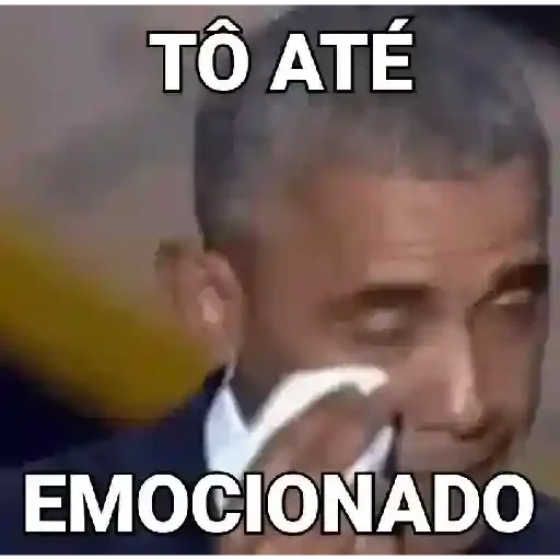 Um homem mais velho com cabelo grisalho e um terno escuro, com a mão na frente do rosto e expressão emocional. O texto 'TÔ ATÉ EMOCIONADO' está escrito em cima e embaixo da imagem.