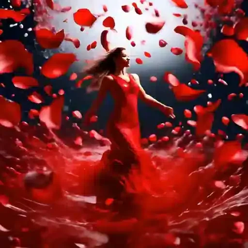 Mulher de vestido vermelho cercada por pétalas de rosa vermelhas.