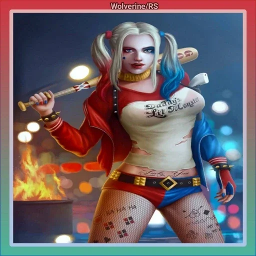Uma mulher com cabelo loiro e maquiagem colorida, vestida com uma fantasia de Harley Quinn, incluindo uma jaqueta vermelha e azul, segurando um martelo com uma luz na ponta.