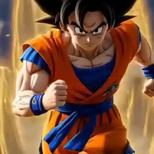 Goku com cabelo preto espetado em uma pose de luta, com chamas azuis saindo de suas mãos.
