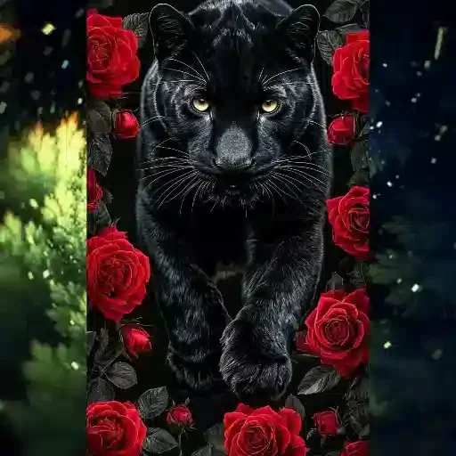 Um gato preto com olhos amarelos olha diretamente para a frente, cercado por rosas vermelhas.