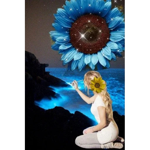Uma mulher de cabelos longos e loiros, vestida de branco, está ajoelhada diante de um lago azul à noite, com uma flor amarela no cabelo, e uma grande flor azul com um olho no centro flutua acima dela.