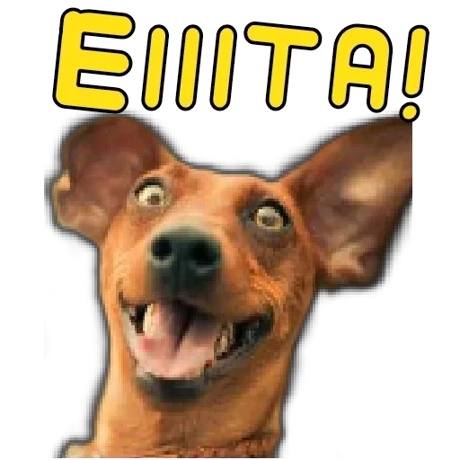 Um cachorro com orelhas grandes e expressão surpresa, com a palavra 'EIIITA!' em letras amarelas acima dele.