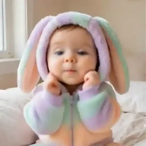 Um bebê com um macacão de coelho pastel, com orelhas grandes e fofas, posa com as mãos no rosto.