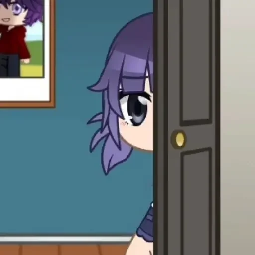 Garota com cabelo roxo espiando por trás de uma porta, com um quadro na parede ao fundo.